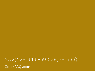 YUV 128.949,-59.628,38.633 Color is a normal orange color and the nearest color is Hot Toddy #b38007. Hex code #ad8208 and RGB value is rgb(173,130,8). In RGB color space, this color is composed of 68% red, 51% green, 3% blue, In CMYK color space, this color is composed of 0% cyan, 25% magenta, 95% yellow , 32% black , In HSL color space, this color has a hue angle of 44° , 91% saturation and 35% lightness.