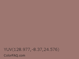 YUV 128.977,-8.37,24.576 Color is a normal red color and the nearest color is Burnished Brown #a17a74. Hex code #9d7670 and RGB value is rgb(157,118,112). In RGB color space, this color is composed of 62% red, 46% green, 44% blue, In CMYK color space, this color is composed of 0% cyan, 25% magenta, 29% yellow , 38% black , In HSL color space, this color has a hue angle of 8° , 19% saturation and 53% lightness.