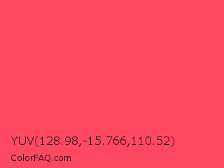 YUV 128.98,-15.766,110.52 Color is a light red color and the nearest color is Magic Potion #ff4466. Hex code #ff4761 and RGB value is rgb(255,71,97). In RGB color space, this color is composed of 100% red, 28% green, 38% blue, In CMYK color space, this color is composed of 0% cyan, 72% magenta, 62% yellow , 0% black , In HSL color space, this color has a hue angle of 352° , 100% saturation and 64% lightness.
