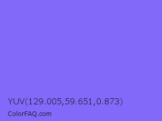 YUV 129.005,59.651,0.873 Color is a light indigo color and the nearest color is Medium Slate Blue #7b68ee. Hex code #8269fa and RGB value is rgb(130,105,250). In RGB color space, this color is composed of 51% red, 41% green, 98% blue, In CMYK color space, this color is composed of 48% cyan, 58% magenta, 0% yellow , 2% black , In HSL color space, this color has a hue angle of 250° , 94% saturation and 70% lightness.