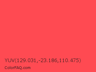 YUV 129.031,-23.186,110.475 Color is a light red color and the nearest color is Sunburnt Cyclops #ff404c. Hex code #ff4a52 and RGB value is rgb(255,74,82). In RGB color space, this color is composed of 100% red, 29% green, 32% blue, In CMYK color space, this color is composed of 0% cyan, 71% magenta, 68% yellow , 0% black , In HSL color space, this color has a hue angle of 357° , 100% saturation and 65% lightness.