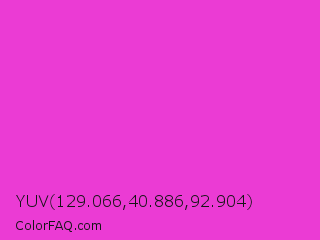 YUV 129.066,40.886,92.904 Color is a normal magenta color and the nearest color is Razzle Dazzle Rose #ff33cc. Hex code #eb3bd4 and RGB value is rgb(235,59,212). In RGB color space, this color is composed of 92% red, 23% green, 83% blue, In CMYK color space, this color is composed of 0% cyan, 75% magenta, 10% yellow , 8% black , In HSL color space, this color has a hue angle of 308° , 81% saturation and 58% lightness.
