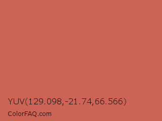 YUV 129.098,-21.74,66.566 Color is a normal red color and the nearest color is Chestnut Rose #cd5c5c. Hex code #cd6355 and RGB value is rgb(205,99,85). In RGB color space, this color is composed of 80% red, 39% green, 33% blue, In CMYK color space, this color is composed of 0% cyan, 52% magenta, 59% yellow , 20% black , In HSL color space, this color has a hue angle of 7° , 55% saturation and 57% lightness.