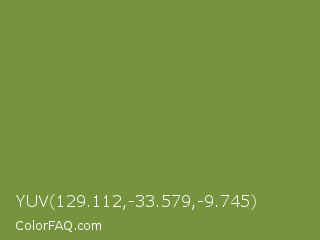 YUV 129.112,-33.579,-9.745 Color is a normal green color and the nearest color is Palm Leaf #6f9940. Hex code #76943d and RGB value is rgb(118,148,61). In RGB color space, this color is composed of 46% red, 58% green, 24% blue, In CMYK color space, this color is composed of 20% cyan, 0% magenta, 59% yellow , 42% black , In HSL color space, this color has a hue angle of 81° , 42% saturation and 41% lightness.