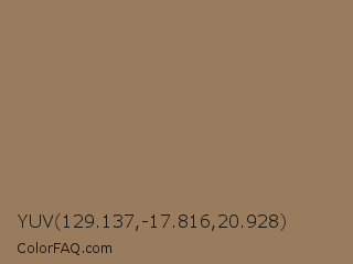 YUV 129.137,-17.816,20.928 Color is a normal orange color and the nearest color is Chamoisee #a0785a. Hex code #997c5d and RGB value is rgb(153,124,93). In RGB color space, this color is composed of 60% red, 49% green, 36% blue, In CMYK color space, this color is composed of 0% cyan, 19% magenta, 39% yellow , 40% black , In HSL color space, this color has a hue angle of 31° , 24% saturation and 48% lightness.