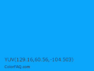 YUV 129.16,60.56,-104.503 Color is a normal blue color and the nearest color is Vivid Cerulean #00aaee. Hex code #0aa6fc and RGB value is rgb(10,166,252). In RGB color space, this color is composed of 4% red, 65% green, 99% blue, In CMYK color space, this color is composed of 96% cyan, 34% magenta, 0% yellow , 1% black , In HSL color space, this color has a hue angle of 201° , 98% saturation and 51% lightness.