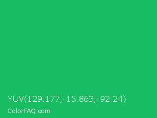 YUV 129.177,-15.863,-92.24 Color is a normal green color and the nearest color is Green Crayola #1cac78. Hex code #18bd61 and RGB value is rgb(24,189,97). In RGB color space, this color is composed of 9% red, 74% green, 38% blue, In CMYK color space, this color is composed of 87% cyan, 0% magenta, 49% yellow , 26% black , In HSL color space, this color has a hue angle of 147° , 77% saturation and 42% lightness.