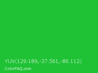 YUV 129.189,-37.561,-86.112 Color is a normal green color and the nearest color is Lime Green #32cd32. Hex code #1fc235 and RGB value is rgb(31,194,53). In RGB color space, this color is composed of 12% red, 76% green, 21% blue, In CMYK color space, this color is composed of 84% cyan, 0% magenta, 73% yellow , 24% black , In HSL color space, this color has a hue angle of 128° , 72% saturation and 44% lightness.