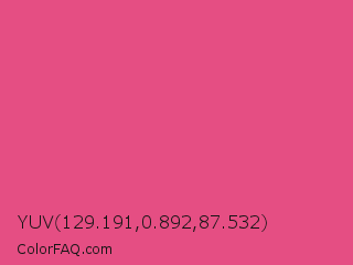 YUV 129.191,0.892,87.532 Color is a normal rose color and the nearest color is Dark Pink #e75480. Hex code #e54e83 and RGB value is rgb(229,78,131). In RGB color space, this color is composed of 90% red, 31% green, 51% blue, In CMYK color space, this color is composed of 0% cyan, 66% magenta, 43% yellow , 10% black , In HSL color space, this color has a hue angle of 339° , 74% saturation and 60% lightness.