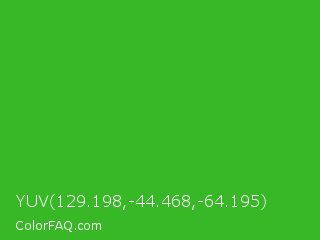 YUV 129.198,-44.468,-64.195 Color is a normal green color and the nearest color is Wageningen Green #34b233. Hex code #38b827 and RGB value is rgb(56,184,39). In RGB color space, this color is composed of 22% red, 72% green, 15% blue, In CMYK color space, this color is composed of 70% cyan, 0% magenta, 79% yellow , 28% black , In HSL color space, this color has a hue angle of 113° , 65% saturation and 44% lightness.