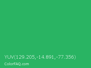 YUV 129.205,-14.891,-77.356 Color is a normal green color and the nearest color is Medium Sea Green #3cb371. Hex code #29b463 and RGB value is rgb(41,180,99). In RGB color space, this color is composed of 16% red, 71% green, 39% blue, In CMYK color space, this color is composed of 77% cyan, 0% magenta, 45% yellow , 29% black , In HSL color space, this color has a hue angle of 145° , 63% saturation and 43% lightness.