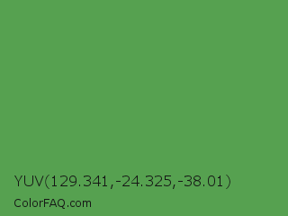 YUV 129.341,-24.325,-38.01 Color is a normal green color and the nearest color is Fruit Salad #4f9d5d. Hex code #56a150 and RGB value is rgb(86,161,80). In RGB color space, this color is composed of 34% red, 63% green, 31% blue, In CMYK color space, this color is composed of 47% cyan, 0% magenta, 50% yellow , 37% black , In HSL color space, this color has a hue angle of 116° , 34% saturation and 47% lightness.