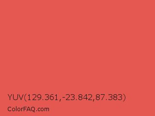 YUV 129.361,-23.842,87.383 Color is a light red color and the nearest color is Jelly Bean #da614e. Hex code #e55851 and RGB value is rgb(229,88,81). In RGB color space, this color is composed of 90% red, 35% green, 32% blue, In CMYK color space, this color is composed of 0% cyan, 62% magenta, 65% yellow , 10% black , In HSL color space, this color has a hue angle of 3° , 74% saturation and 61% lightness.