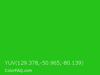 YUV 129.378,-50.965,-80.139 Color is a normal green color and the nearest color is Lime Green #32cd32. Hex code #26c41a and RGB value is rgb(38,196,26). In RGB color space, this color is composed of 15% red, 77% green, 10% blue, In CMYK color space, this color is composed of 81% cyan, 0% magenta, 87% yellow , 23% black , In HSL color space, this color has a hue angle of 116° , 77% saturation and 44% lightness.