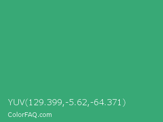 YUV 129.399,-5.62,-64.371 Color is a normal green color and the nearest color is Ocean Green #41aa78. Hex code #38a976 and RGB value is rgb(56,169,118). In RGB color space, this color is composed of 22% red, 66% green, 46% blue, In CMYK color space, this color is composed of 67% cyan, 0% magenta, 30% yellow , 34% black , In HSL color space, this color has a hue angle of 153° , 50% saturation and 44% lightness.