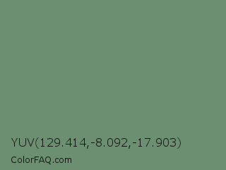 YUV 129.414,-8.092,-17.903 Color is a normal green color and the nearest color is Viridian Green #678975. Hex code #6d8f71 and RGB value is rgb(109,143,113). In RGB color space, this color is composed of 43% red, 56% green, 44% blue, In CMYK color space, this color is composed of 24% cyan, 0% magenta, 21% yellow , 44% black , In HSL color space, this color has a hue angle of 127° , 13% saturation and 49% lightness.