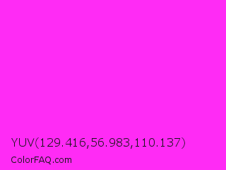 YUV 129.416,56.983,110.137 Color is a normal magenta color and the nearest color is Hot Magenta #ff1dce. Hex code #ff2bf5 and RGB value is rgb(255,43,245). In RGB color space, this color is composed of 100% red, 17% green, 96% blue, In CMYK color space, this color is composed of 0% cyan, 83% magenta, 4% yellow , 0% black , In HSL color space, this color has a hue angle of 303° , 100% saturation and 58% lightness.