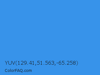 YUV 129.41,51.563,-65.258 Color is a normal blue color and the nearest color is Bleu De France #318ce7. Hex code #3793ea and RGB value is rgb(55,147,234). In RGB color space, this color is composed of 22% red, 58% green, 92% blue, In CMYK color space, this color is composed of 76% cyan, 37% magenta, 0% yellow , 8% black , In HSL color space, this color has a hue angle of 209° , 81% saturation and 57% lightness.
