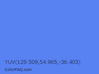 YUV 129.509,54.965,-36.403 Color is a light blue color and the nearest color is Blueberry #4f86f7. Hex code #5881f1 and RGB value is rgb(88,129,241). In RGB color space, this color is composed of 35% red, 51% green, 95% blue, In CMYK color space, this color is composed of 63% cyan, 46% magenta, 0% yellow , 5% black , In HSL color space, this color has a hue angle of 224° , 85% saturation and 65% lightness.
