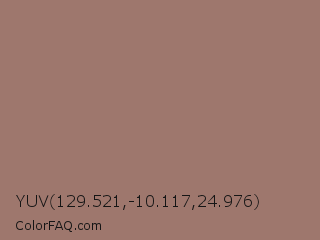 YUV 129.521,-10.117,24.976 Color is a normal red color and the nearest color is Burnished Brown #a17a74. Hex code #9e776d and RGB value is rgb(158,119,109). In RGB color space, this color is composed of 62% red, 47% green, 43% blue, In CMYK color space, this color is composed of 0% cyan, 25% magenta, 31% yellow , 38% black , In HSL color space, this color has a hue angle of 12° , 20% saturation and 52% lightness.