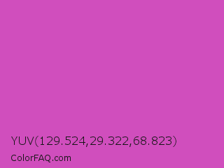 YUV 129.524,29.322,68.823 Color is a normal magenta color and the nearest color is Fuchsia Pink #c154c1. Hex code #d04ebd and RGB value is rgb(208,78,189). In RGB color space, this color is composed of 82% red, 31% green, 74% blue, In CMYK color space, this color is composed of 0% cyan, 63% magenta, 9% yellow , 18% black , In HSL color space, this color has a hue angle of 309° , 58% saturation and 56% lightness.