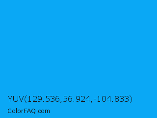 YUV 129.536,56.924,-104.833 Color is a normal blue color and the nearest color is Vivid Cerulean #00aaee. Hex code #0aa8f5 and RGB value is rgb(10,168,245). In RGB color space, this color is composed of 4% red, 66% green, 96% blue, In CMYK color space, this color is composed of 96% cyan, 31% magenta, 0% yellow , 4% black , In HSL color space, this color has a hue angle of 200° , 92% saturation and 50% lightness.