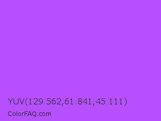 YUV 129.562,61.841,45.111 Color is a light purple color and the nearest color is Navy Purple #9457eb. Hex code #b54fff and RGB value is rgb(181,79,255). In RGB color space, this color is composed of 71% red, 31% green, 100% blue, In CMYK color space, this color is composed of 29% cyan, 69% magenta, 0% yellow , 0% black , In HSL color space, this color has a hue angle of 275° , 100% saturation and 65% lightness.
