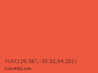 YUV 129.587,-33.32,94.201 Color is a normal red color and the nearest color is Carmine Pink #eb4c42. Hex code #ed583e and RGB value is rgb(237,88,62). In RGB color space, this color is composed of 93% red, 35% green, 24% blue, In CMYK color space, this color is composed of 0% cyan, 63% magenta, 74% yellow , 7% black , In HSL color space, this color has a hue angle of 9° , 83% saturation and 59% lightness.