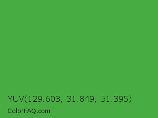 YUV 129.603,-31.849,-51.395 Color is a normal green color and the nearest color is Apple #4fa83d. Hex code #47ac41 and RGB value is rgb(71,172,65). In RGB color space, this color is composed of 28% red, 67% green, 25% blue, In CMYK color space, this color is composed of 59% cyan, 0% magenta, 62% yellow , 33% black , In HSL color space, this color has a hue angle of 117° , 45% saturation and 46% lightness.