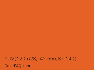 YUV 129.628,-45.666,87.149 Color is a normal orange color and the nearest color is Vivid Vermilion #e56024. Hex code #e56125 and RGB value is rgb(229,97,37). In RGB color space, this color is composed of 90% red, 38% green, 15% blue, In CMYK color space, this color is composed of 0% cyan, 58% magenta, 84% yellow , 10% black , In HSL color space, this color has a hue angle of 19° , 79% saturation and 52% lightness.
