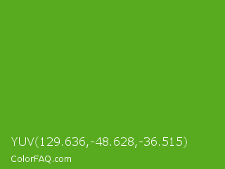 YUV 129.636,-48.628,-36.515 Color is a normal green color and the nearest color is Christi #67a712. Hex code #58aa1f and RGB value is rgb(88,170,31). In RGB color space, this color is composed of 35% red, 67% green, 12% blue, In CMYK color space, this color is composed of 48% cyan, 0% magenta, 82% yellow , 33% black , In HSL color space, this color has a hue angle of 95° , 69% saturation and 39% lightness.