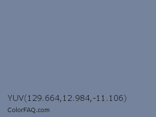 YUV 129.664,12.984,-11.106 Color is a normal blue color and the nearest color is Light Slate Gray #778899. Hex code #75839c and RGB value is rgb(117,131,156). In RGB color space, this color is composed of 46% red, 51% green, 61% blue, In CMYK color space, this color is composed of 25% cyan, 16% magenta, 0% yellow , 39% black , In HSL color space, this color has a hue angle of 218° , 16% saturation and 54% lightness.