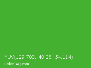 YUV 129.703,-40.28,-54.114 Color is a normal green color and the nearest color is Wageningen Green #34b233. Hex code #44b130 and RGB value is rgb(68,177,48). In RGB color space, this color is composed of 27% red, 69% green, 19% blue, In CMYK color space, this color is composed of 62% cyan, 0% magenta, 73% yellow , 31% black , In HSL color space, this color has a hue angle of 111° , 57% saturation and 44% lightness.