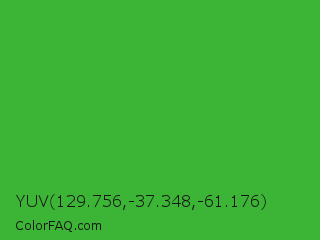 YUV 129.756,-37.348,-61.176 Color is a normal green color and the nearest color is Wageningen Green #34b233. Hex code #3cb436 and RGB value is rgb(60,180,54). In RGB color space, this color is composed of 24% red, 71% green, 21% blue, In CMYK color space, this color is composed of 67% cyan, 0% magenta, 70% yellow , 29% black , In HSL color space, this color has a hue angle of 117° , 54% saturation and 46% lightness.