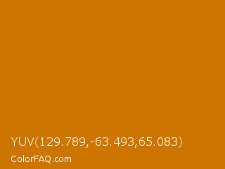YUV 129.789,-63.493,65.083 Color is a normal orange color and the nearest color is Indochine #c26b03. Hex code #cc7501 and RGB value is rgb(204,117,1). In RGB color space, this color is composed of 80% red, 46% green, 0% blue, In CMYK color space, this color is composed of 0% cyan, 43% magenta, 100% yellow , 20% black , In HSL color space, this color has a hue angle of 34° , 99% saturation and 40% lightness.