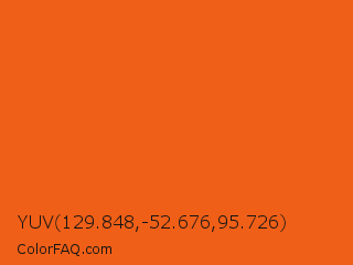 YUV 129.848,-52.676,95.726 Color is a normal orange color and the nearest color is Vivid Vermilion #e56024. Hex code #ef5f17 and RGB value is rgb(239,95,23). In RGB color space, this color is composed of 94% red, 37% green, 9% blue, In CMYK color space, this color is composed of 0% cyan, 60% magenta, 90% yellow , 6% black , In HSL color space, this color has a hue angle of 20° , 87% saturation and 51% lightness.