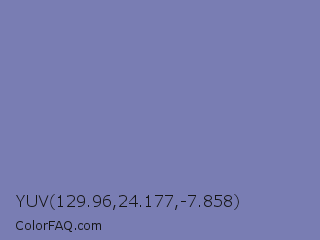 YUV 129.96,24.177,-7.858 Color is a normal blue color and the nearest color is Wild Blue Yonder #7a89b8. Hex code #797db3 and RGB value is rgb(121,125,179). In RGB color space, this color is composed of 47% red, 49% green, 70% blue, In CMYK color space, this color is composed of 32% cyan, 30% magenta, 0% yellow , 30% black , In HSL color space, this color has a hue angle of 236° , 28% saturation and 59% lightness.