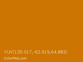 YUV 130.017,-62.619,64.883 Color is a normal orange color and the nearest color is Indochine #c26b03. Hex code #cc7503 and RGB value is rgb(204,117,3). In RGB color space, this color is composed of 80% red, 46% green, 1% blue, In CMYK color space, this color is composed of 0% cyan, 43% magenta, 99% yellow , 20% black , In HSL color space, this color has a hue angle of 34° , 97% saturation and 41% lightness.