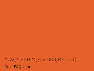 YUV 130.024,-42.903,87.679 Color is a normal orange color and the nearest color is Vivid Vermilion #e56024. Hex code #e6602b and RGB value is rgb(230,96,43). In RGB color space, this color is composed of 90% red, 38% green, 17% blue, In CMYK color space, this color is composed of 0% cyan, 58% magenta, 81% yellow , 10% black , In HSL color space, this color has a hue angle of 17° , 79% saturation and 54% lightness.