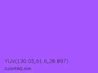YUV 130.05,61.6,28.897 Color is a light violet color and the nearest color is Navy Purple #9457eb. Hex code #a359ff and RGB value is rgb(163,89,255). In RGB color space, this color is composed of 64% red, 35% green, 100% blue, In CMYK color space, this color is composed of 36% cyan, 65% magenta, 0% yellow , 0% black , In HSL color space, this color has a hue angle of 267° , 100% saturation and 67% lightness.