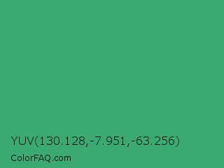 YUV 130.128,-7.951,-63.256 Color is a normal green color and the nearest color is Ocean Green #41aa78. Hex code #3aaa72 and RGB value is rgb(58,170,114). In RGB color space, this color is composed of 23% red, 67% green, 45% blue, In CMYK color space, this color is composed of 66% cyan, 0% magenta, 33% yellow , 33% black , In HSL color space, this color has a hue angle of 150° , 49% saturation and 45% lightness.