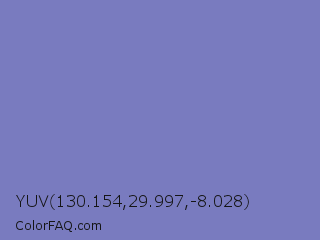 YUV 130.154,29.997,-8.028 Color is a light blue color and the nearest color is Wild Blue Yonder #7a89b8. Hex code #797bbf and RGB value is rgb(121,123,191). In RGB color space, this color is composed of 47% red, 48% green, 75% blue, In CMYK color space, this color is composed of 37% cyan, 36% magenta, 0% yellow , 25% black , In HSL color space, this color has a hue angle of 238° , 35% saturation and 61% lightness.