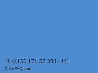 YUV 130.171,37.384,-44 Color is a normal blue color and the nearest color is Celestial Blue #4997d0. Hex code #508dce and RGB value is rgb(80,141,206). In RGB color space, this color is composed of 31% red, 55% green, 81% blue, In CMYK color space, this color is composed of 61% cyan, 32% magenta, 0% yellow , 19% black , In HSL color space, this color has a hue angle of 211° , 56% saturation and 56% lightness.