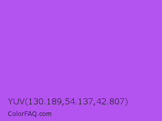 YUV 130.189,54.137,42.807 Color is a light purple color and the nearest color is Medium Orchid #ba55d3. Hex code #b354f0 and RGB value is rgb(179,84,240). In RGB color space, this color is composed of 70% red, 33% green, 94% blue, In CMYK color space, this color is composed of 25% cyan, 65% magenta, 0% yellow , 6% black , In HSL color space, this color has a hue angle of 277° , 84% saturation and 64% lightness.