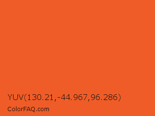 YUV 130.21,-44.967,96.286 Color is a normal orange color and the nearest color is Flamingo #f2552a. Hex code #f05c27 and RGB value is rgb(240,92,39). In RGB color space, this color is composed of 94% red, 36% green, 15% blue, In CMYK color space, this color is composed of 0% cyan, 62% magenta, 84% yellow , 6% black , In HSL color space, this color has a hue angle of 16° , 87% saturation and 55% lightness.