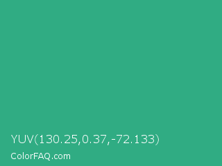 YUV 130.25,0.37,-72.133 Color is a normal green color and the nearest color is Jungle Green #29ab87. Hex code #30ac83 and RGB value is rgb(48,172,131). In RGB color space, this color is composed of 19% red, 67% green, 51% blue, In CMYK color space, this color is composed of 72% cyan, 0% magenta, 24% yellow , 33% black , In HSL color space, this color has a hue angle of 160° , 56% saturation and 43% lightness.