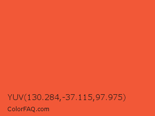 YUV 130.284,-37.115,97.975 Color is a normal red color and the nearest color is Orange Soda #fa5b3d. Hex code #f25837 and RGB value is rgb(242,88,55). In RGB color space, this color is composed of 95% red, 35% green, 22% blue, In CMYK color space, this color is composed of 0% cyan, 64% magenta, 77% yellow , 5% black , In HSL color space, this color has a hue angle of 11° , 88% saturation and 58% lightness.