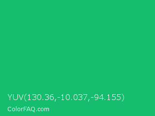 YUV 130.36,-10.037,-94.155 Color is a normal green color and the nearest color is Green Crayola #1cac78. Hex code #17bd6e and RGB value is rgb(23,189,110). In RGB color space, this color is composed of 9% red, 74% green, 43% blue, In CMYK color space, this color is composed of 88% cyan, 0% magenta, 42% yellow , 26% black , In HSL color space, this color has a hue angle of 151° , 78% saturation and 42% lightness.