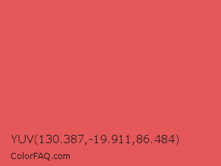 YUV 130.387,-19.911,86.484 Color is a light red color and the nearest color is Mandy #e25465. Hex code #e5585a and RGB value is rgb(229,88,90). In RGB color space, this color is composed of 90% red, 35% green, 35% blue, In CMYK color space, this color is composed of 0% cyan, 62% magenta, 61% yellow , 10% black , In HSL color space, this color has a hue angle of 359° , 73% saturation and 62% lightness.
