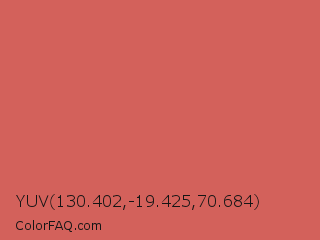 YUV 130.402,-19.425,70.684 Color is a normal red color and the nearest color is Chestnut Rose #cd5c5c. Hex code #d3615b and RGB value is rgb(211,97,91). In RGB color space, this color is composed of 83% red, 38% green, 36% blue, In CMYK color space, this color is composed of 0% cyan, 54% magenta, 57% yellow , 17% black , In HSL color space, this color has a hue angle of 3° , 58% saturation and 59% lightness.